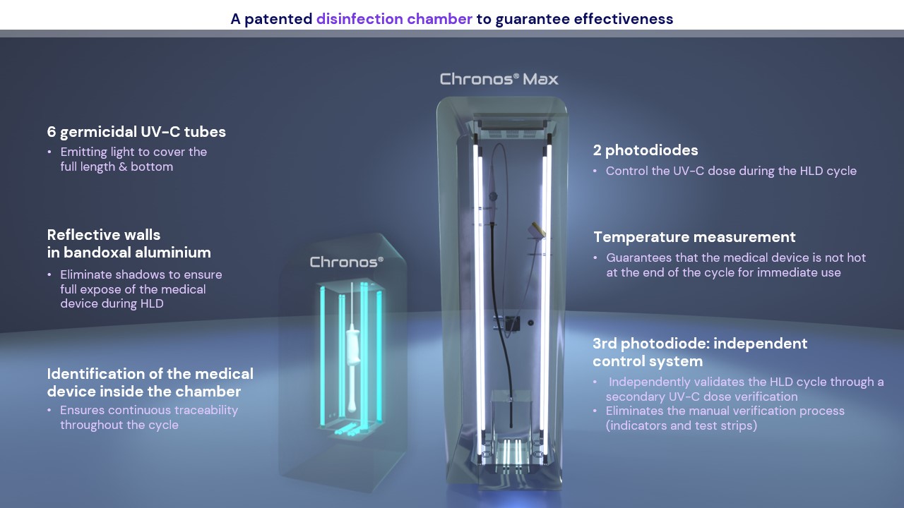 These chambers are equipped with six germicidal UV-C lamps, arranged to cover the entire chamber volume from bottom to top, ensuring homogeneous exposure of the medical device. Their bandoxal aluminum design enhances UV diffusion, eliminating shadowed areas and ensuring optimal exposure for high-level disinfection.